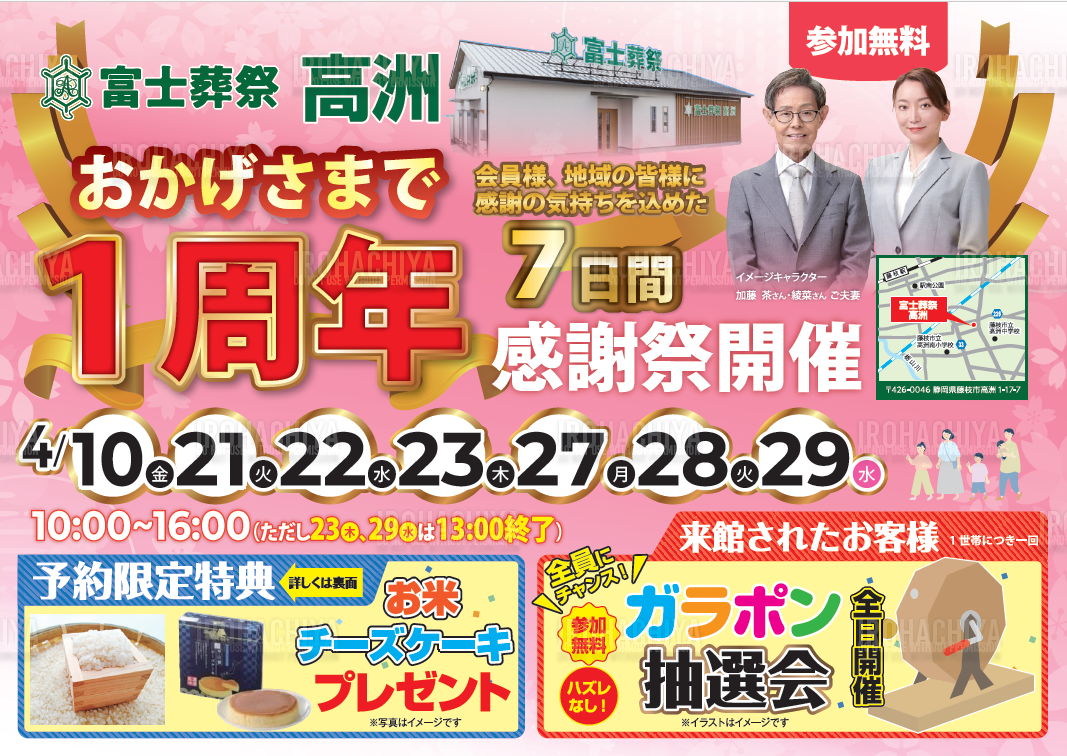 【オープン1周年記念大感謝祭】開催! 富士葬祭 高洲(藤枝市)