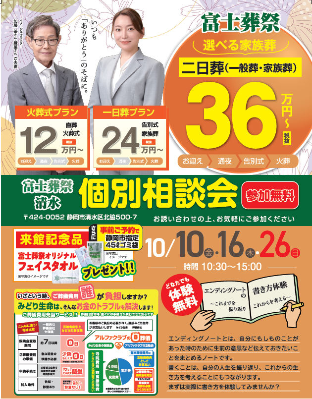 NEWS 富士葬祭からのお知らせ TOP 富士葬祭からのお知らせ 【個別相談会】開催! 富士葬祭 清水(静岡市清水区) イベント 2025.10.02 【個別相談会】開催! 富士葬祭 清水(静岡市清水区) 静岡県清水区の富士葬祭 清水にて 個別相談会を開催致します。 開催日:2025年10月10日・16日・26日 時 間:10:30~15:00 気になる葬儀費用を中心に、家族葬セミナーなど 来場記念品つきのイベントになります。 たくさんの地域の皆様のお越しをお待ちしております!