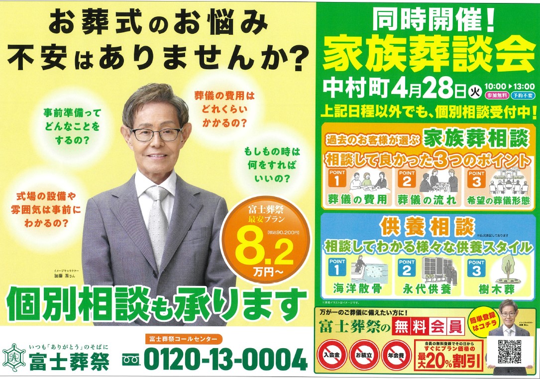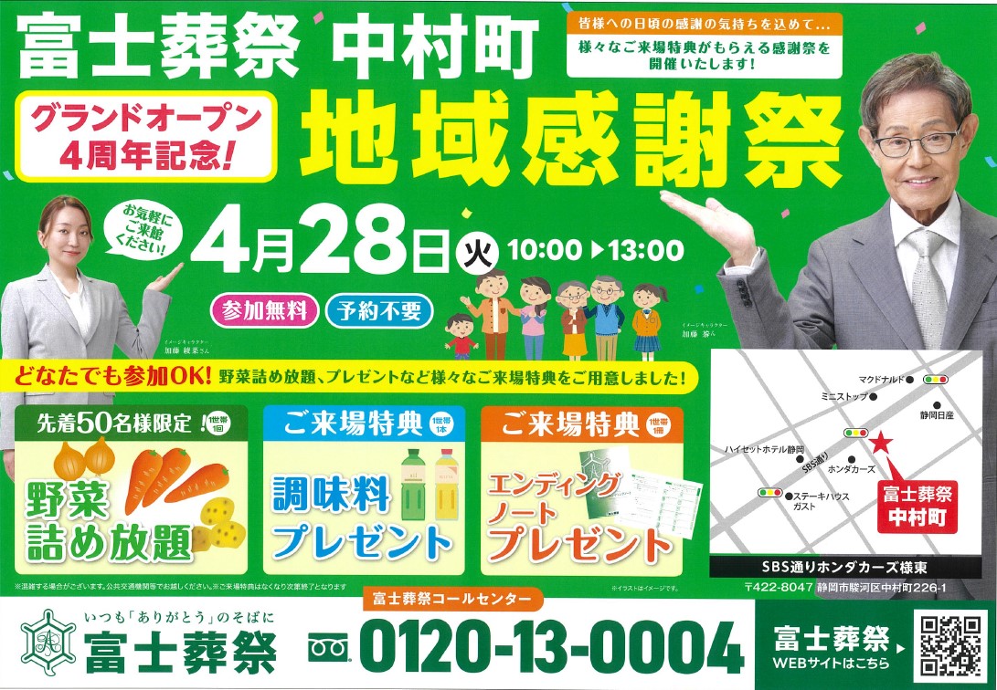 NEWS 富士葬祭からのお知らせ TOP 富士葬祭からのお知らせ 【地域感謝祭】開催! 富士葬祭 中村町(静岡市駿河区) イベント 2026.04.25 【地域感謝祭】開催! 富士葬祭 中村町(静岡市駿河区) 静岡市駿河区の富士葬祭 中村町におきまして 会員様、地域の皆様に感謝の気持ちを込めた オープン4周年感謝祭を開催致します! 開催日:2026年4月28日(火) 時 間:10:00-13:00 場 所:富士葬祭 中村町 所 在:静岡市駿河区中村町226-1 予約不要!参加無料! 〇先着!プレゼント 野菜詰め放題 50名様 〇ご来場プレゼント 選べる調味料 同時開催! 〇家族葬談会 ・家族葬相談コーナー ・供養相談コーナー 多くのお客様のお越しを お待ちしております!