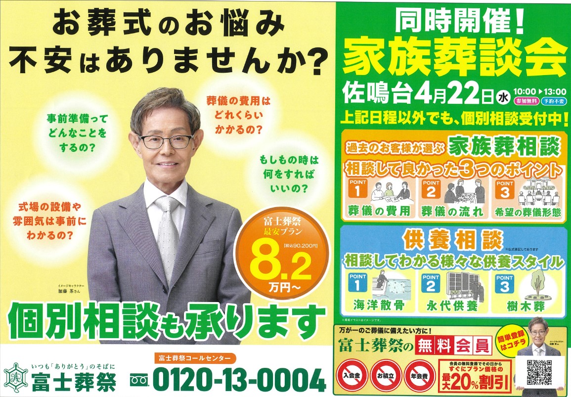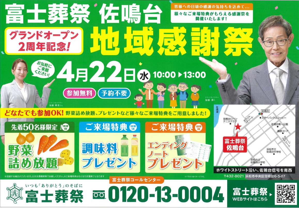 NEWS 富士葬祭からのお知らせ TOP 富士葬祭からのお知らせ 【地域感謝祭】開催! 富士葬祭 佐鳴台(浜松市) イベント 2026.04.20 【地域感謝祭】開催! 富士葬祭 佐鳴台(浜松市) 浜松市の富士葬祭 佐鳴台におきまして 会員様、地域の皆様に感謝の気持ちを込めた 感謝祭を開催致します! 開催日:2026年4月22日(水) 時 間:10:00-13:00 場 所:富士葬祭 佐鳴台 所 在:浜松市中央区佐鳴台6-5-17 予約不要!参加無料! 〇先着!プレゼント 野菜詰め放題 50名様 〇ご来場プレゼント 選べる調味料 同時開催! 〇家族葬談会 ・家族葬相談コーナー ・供養相談コーナー 多くのお客様のお越しを お待ちしております!