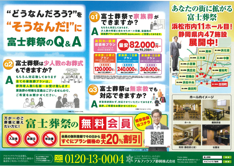 NEWS 富士葬祭からのお知らせ TOP 富士葬祭からのお知らせ 【新規オープン!】富士葬祭 白羽町(浜松市) トピックス 2025.11.18 【新規オープン!】富士葬祭 白羽町(浜松市) 静岡県浜松市に、市内11ホール目の 富士葬祭がオープン致します! オープン予定日 2025年12月6日(土) 富士葬祭 白羽町 浜松市中央区白羽町15-1 家族葬を中心とした、1日1組の貸切ホールとなります。 浜松市旧南区に富士葬祭が初オープンでございます。 本日より、地域へのPRをスタート致します。 工事もラストスパートとなり お披露目まで今しばらくおまちくださいませ。